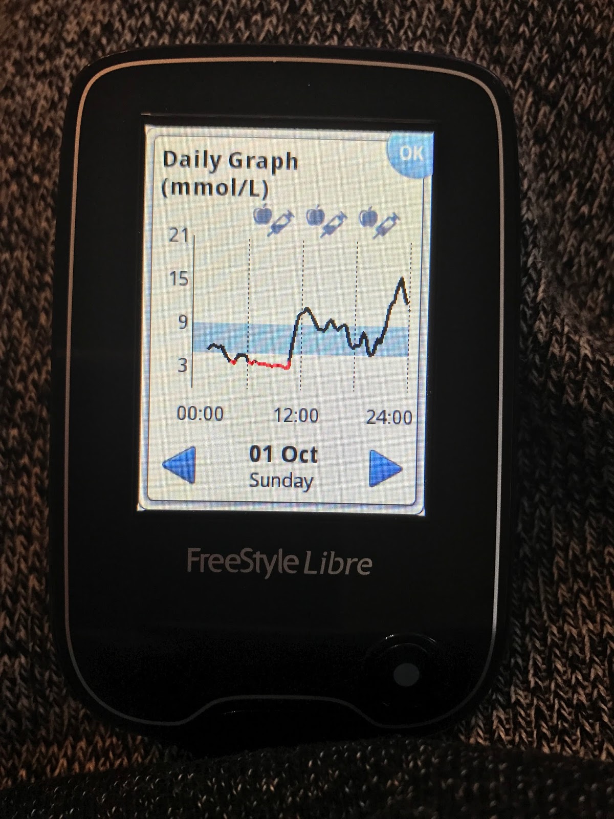 Now it was upsetting to see that my diabetes wasn't under control when I was trying hard to keep it at bay, however now having this data, my diabetic nurse and myself could start fresh and hatch a plan. We put me on a new long acting insulin as we could clearly see (for whatever reason) my current long acting insulin was just not working. And even better, while wearing the sensor I could actively see if the new insulin was doing it's job and if I needed to adjust it. After a couple of bad days and deciding to give myself one more unit than my nurse told me to take, it was making a difference!